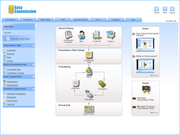 Easy-Commission is an easy to use application to manage customer relationships, invoice customers and to calculate sales commissions. It can calculate sales commissions in a simple and easy manner. It takes sales data you enter, applies commission calculations you have set, to produce commission statements. It is completely web based and allows your sales reps to have direct access to their commission statements. There are typically three types of users, Finance, Sales Management and Sales Reps. The entire application is available on the web. And all the users can have access to their own information.