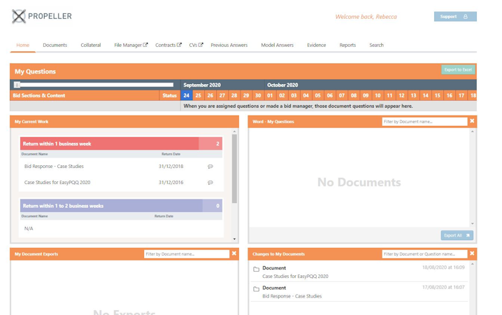 EasyPQQ’s project management tools allow users to control the document authoring process while also creating proposals, by assigning tasks to writers and reviewers, setting deadlines, monitoring progress, issuing reminders, and generating reports. Project and document statuses can be tracked in real-time, with a traffic-light system for identifying sections or questions requiring further input. The search engine built into EasyPQQ enables users to find and reuse previously-created content, and can suggest responses for PQQs or tender document based on previous answers.