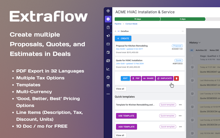 •Auto-populate documents from deal data: With Extraflow, the estimates, quotes, and proposals are pre-filled with critical information pulled directly from the Pipedrive deals. This feature optimizes manual input, errors, and document preparation [processes.