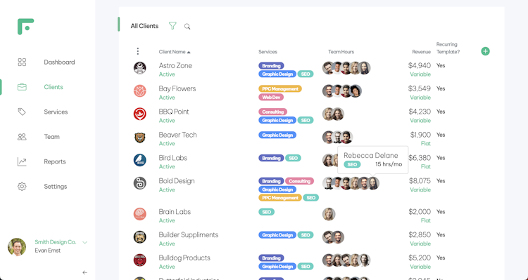 Forekast also helps businesses to manage their teams. The platform allows businesses to create teams and assign team members to specific clients and services. This makes it easy for businesses to coordinate their teams and ensure that the right people are working on the right projects. Additionally, Forekast includes a built-in time tracking system, which allows businesses to track the time that their team members spend on specific projects.