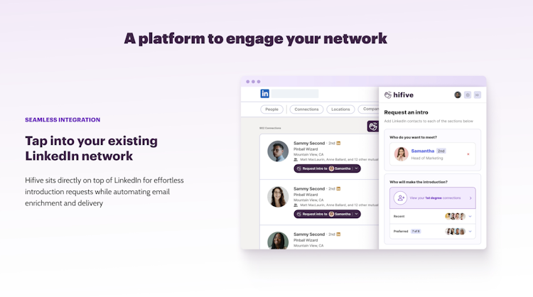 Hifive enables businesses to embrace introductions and connections for a variety of purposes, including sales, recruitment, fundraising, partnerships, and networking processes. It is designed to seamlessly integrate with LinkedIn, enhancing the process of connecting with professionals. By sitting directly atop the LinkedIn platform, Hifive revolutionizes the way introduction requests are made. With a focus on simplicity and efficiency, Hifive streamlines the process of requesting introductions, making it effortless for users to expand their network.