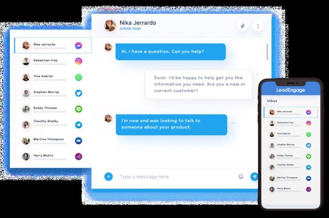 Lead Engage is a CRM platform and lead conversion tool to optimize the sales process. Lead Engage consolidates all the channels, such as Facebook Lead Ads, Facebook Page Get A Quote, Facebook Messenger, Instagram Messages, Twitter DMs, Google Business Profile Messages, Website Lead or Opt-In Widgets, Direct Mail, or QR Code.