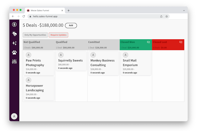 Meow is an open-source app that helps businesses manage sales pipelines and customer data with ease. Teams can create a custom pipeline and name the stages to match unique deal progression. The app's intuitive interface makes it easy to track sales progress, manage pipeline stages and opportunities, and generate reports. What sets Meow apart is that it's an open-source visual sales pipeline dashboard. Managers can freely personalize the software and take advantage of upcoming updates. The entire codebase is available on GitHub. With Meow, operators can also forecast deals based on pipelines and see updates automatically as deals evolve.