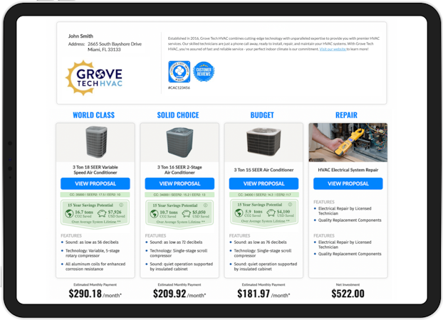 OnCall Air connects with distributors for live pricing, AHRI matchups, and product availability, while smart add-on recommendations help optimize sales and ticket size. With its interactive proposal interface, customers can compare options, view details, and approve quotes from any device.
