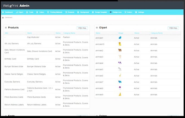 PrintCommerce is an eCommerce management software, which helps print service businesses manage product customization, orders, live preview, printing, and shipping. The platform lets businesses configure the built-in design studio, enabling customers to create new designs or modify predefined templates using customizable cliparts, font styles, and text.