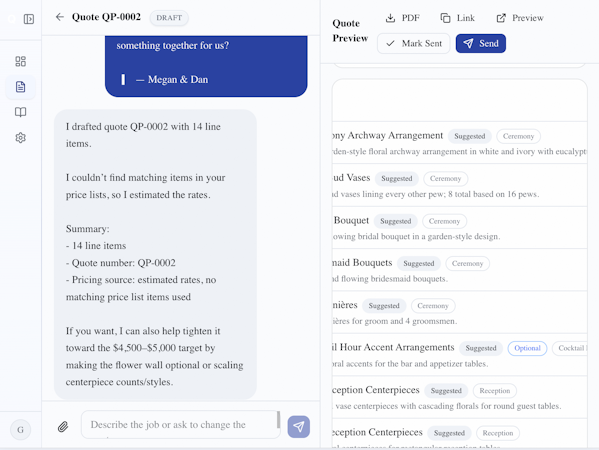 A three step workflow begins with input of a job description, which can be a pasted client email, a rough project scope or an uploaded document in any format. An AI engine analyzes the content, matches items from configured price lists, calculates quantities and totals, and generates professional introductory text. A chat based editing interface enables conversational updates to line items and pricing with immediate application of changes. Smart price list functionality accepts CSV files, PDF documents or photographs and automatically extracts and organizes pricing information across multiple lists.
