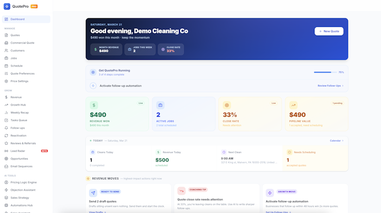 AI-driven quote analysis tools named Rate My Quote and Quote Intelligence Engine provide immediate grading and pricing recommendations. Automated follow-up sequences use artificial intelligence to craft personalized customer messages and maintain consistent communication with prospects. The integrated customer relationship management system tracks all interactions, quotes and notes in a centralized database accessible via web browser or dedicated iPhone application. Job scheduling functionality includes built-in cleaning checklists and synchronization with Google Calendar for coordinated team workflows. The revenue dashboard delivers insight into close rates, pipeline value, revenue trends and profitability metrics. Multi-language support enables quote generation in English, Spanish, Portuguese and Russian. Custom branded intake forms and public request pages facilitate lead capture. Payment processing integrations with Stripe, Venmo and Cash App permit customers to complete transactions directly from accepted proposals.