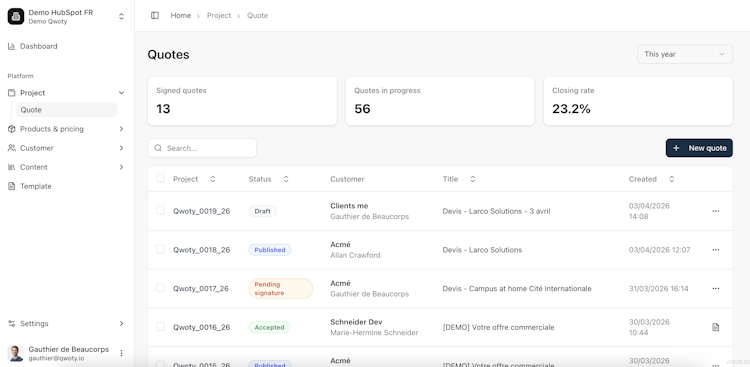 Qwoty integrates with major CRM platforms such as HubSpot, Salesforce and Pipedrive and extends connectivity through an open API for custom integrations with ERP, billing and other enterprise applications. Native CRM integration ensures seamless synchronization of quote and order data across the technology stack and eliminates manual rework. The platform enforces pricing policies, automates handoffs between sales, operations and finance functions and delivers structured data flows that preserve consistency and reduce errors. The system adapts to existing workflows and enables teams to manage revenue processes within familiar environments and established systems.