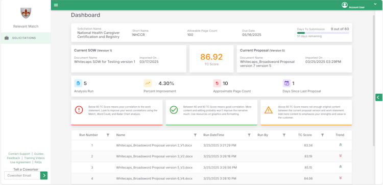 Relevant Match Online (RMO) is a powerful web application designed to optimize your proposal by aligning it with key points from the RFP or solicitation. Built on 20+ years of experience, it helps jump-starts key themes and keeps you on track.
