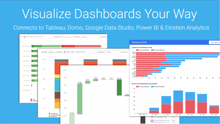 These insights are delivered directly to their CRM or can be visualized in their favorite BI tool (such as Tableau, Domo, Google Data Studio, Power BI or even Einstein Analytics).