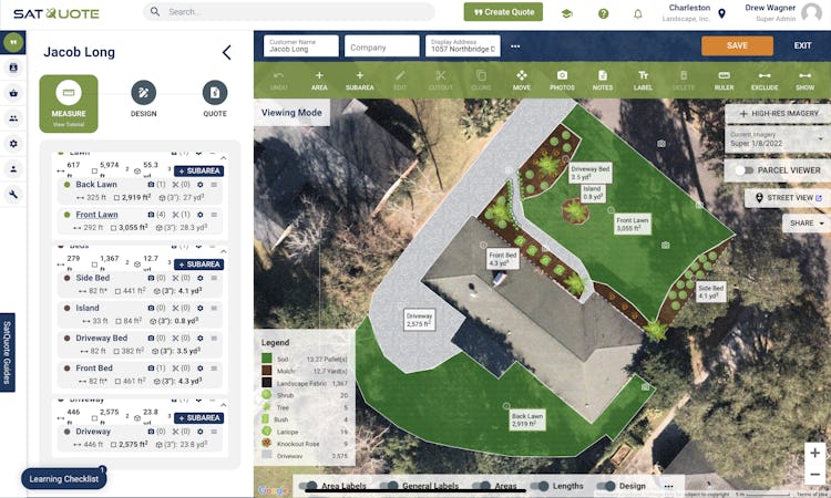 SatQuote is a cloud-based software that helps lawn and landscape contractors measure properties remotely, estimate labor and material needs, create landscape designs, and generate PDF quotes with map images, products, and photos that show your customers what will be done where.