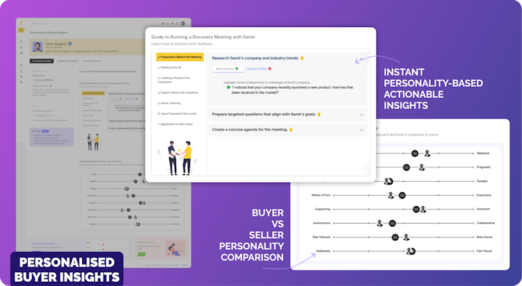 •Group Dynamics - The tool equips sellers to decode stakeholder personalities and navigate the complex interpersonal dynamics of multi-buyer committees. By profiling each contact's DISC and behavioural traits, sellers can anticipate alignment, resistance, and influence patterns. This helps them tailor messaging, identify internal champions, and manage conflicting agendas, turning potential friction into opportunities for collaboration and deal momentum.