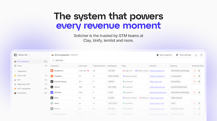 Companies like Clay, Unify and lemlist use Snitcher to capture revenue from high-intent traffic by using our product directly or integrating it into the GTM systems and product experiences they build.
