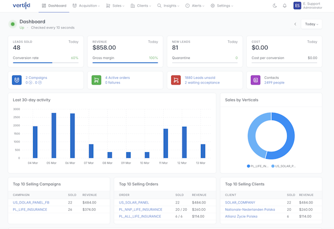 Vertikl’s distribution engine supports advanced routing logic with configurable rules, filters, caps, and retry mechanisms. Users define multiple distribution rules per partner, establish custom pricing models for each buyer relationship, and configure reciprocal lead sharing between trusted accounts. An integrated analytics suite provides visibility into the lead lifecycle, tracks profitability and cost attribution, and delivers performance metrics across all connected channels.