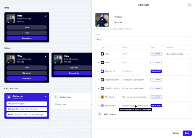 The software allows users to add testimonials, visuals, and human interactive content to a video. Videobot enables executives to collect visitors' information, create product pitches, and more.