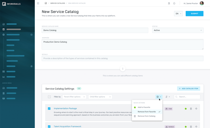 Workrails gives teams a single system of record for the most up to date services offerings. Admins have the ability to update all service elements (price, hours, terms and conditions, and much more) instantly updating the platform for all end users, eliminating discrepancies and ambiguity within the SOW process.