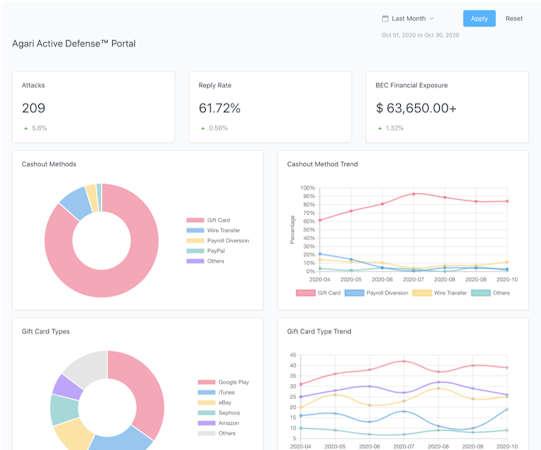 Agari Secure Email Cloud enables team members can utilize the built-in algorithms to conduct impact analysis and identify all affected employees, facilitating quick threat remediation. The active defense portal lets employees gain insights into BEC threats based on parameters, such as attack objectives, originations, affiliations, shapes, and more. With the executive dashboard, business leaders can gain insights into policy performance, domain protection, message authentication, and unauthorized senders.