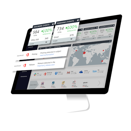 • The security solution connects to any cloud application in one click via API connection. All security can be standardized across your organization and managed from a single dashboard.