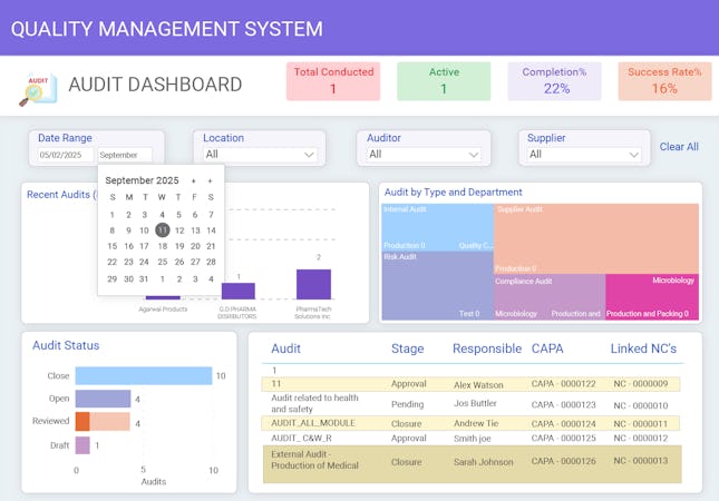 The platform delivers a comprehensive suite of quality management modules covering corrective and preventive action management, change control, incident management, document control, deviation management, audit management, supplier management, training management, risk management, inspection management, and nonconformance management. Each module operates within automated workflows that eliminate manual task follow-ups through configurable no-code and low-code workflow design tools. Interactive dashboards present real-time quality intelligence using key performance indicators and trend analysis for early risk identification. Cross-module linking connects processes across quality domains and collaboration features enable coordinated efforts across departments and teams.