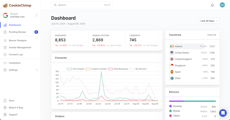 CookieChimp's comprehensive suite of features, including user consent expiration, cross-domain and cross-device consent sharing, cookie declaration, geotargeting, and AB testing, ensures a streamlined user-centric consent management experience.