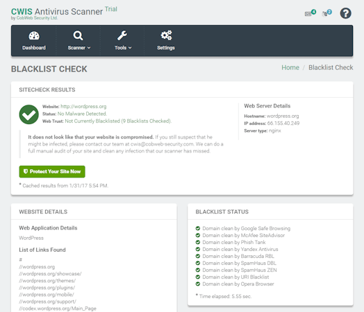 CWIS Antivirus Scanner is a web-based antivirus software that helps businesses in the IT industry streamline network security processes, such as website protection, vulnerability testing, and malware removal. It lets staff members fix hacked websites, detect spyware, perform blacklist checks, and more from a unified platform.