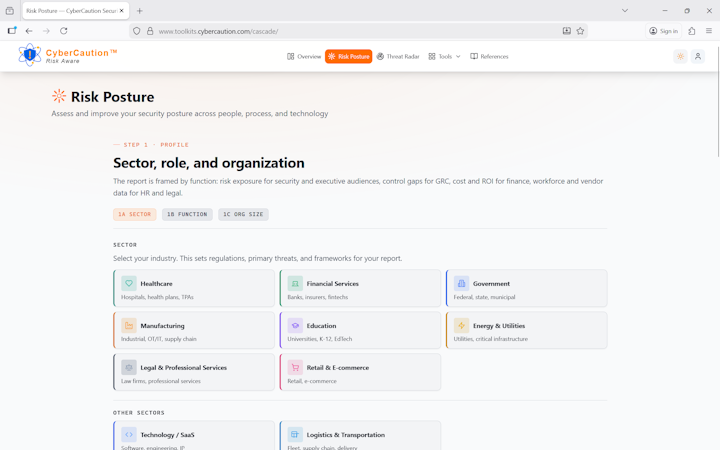 CyberCaution is a ransomware readiness assessment and threat intelligence platform that enables organizations to evaluate exposure to ransomware through structured questionnaire based evaluations and sector specific threat analysis. The platform provides a systematic approach to identify vulnerabilities, assess defensive gaps and implement prioritized remediation strategies aligned with real world threat patterns. It serves organizations across eight industry sectors including healthcare, finance and government entities that require validated ransomware preparedness and executive level visibility into their security posture.