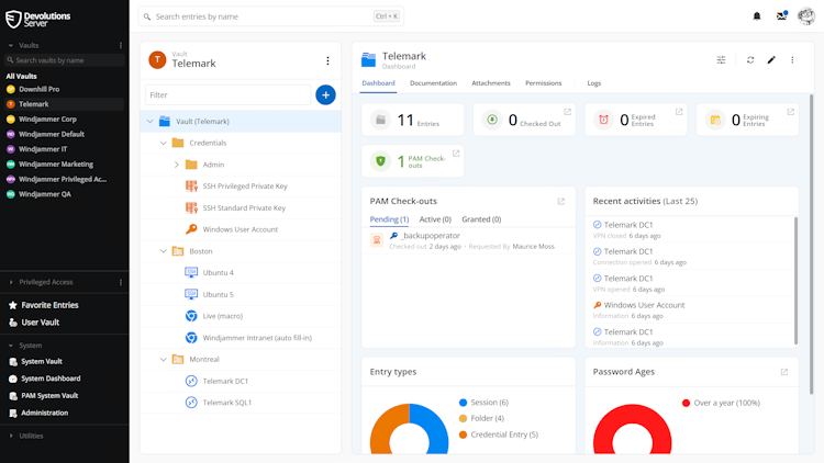 Devolutions Server is a self-hosted credential and privileged access management solution. It provides secure shared vaults, RBAC, MFA, audit trails, and identity provider integration, with native support for Remote Desktop Manager and Gateway.