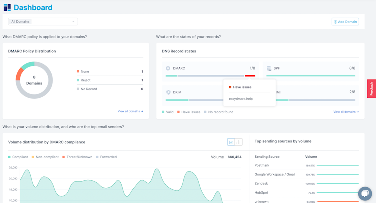EasyDMARC is a comprehensive cloud-native platform designed to simplify email authentication and deliverability management. With its intuitive interface, it offers in-depth visibility into users' email ecosystems, allowing them to monitor traffic, analyze authentication results, and protect their domain's reputation.