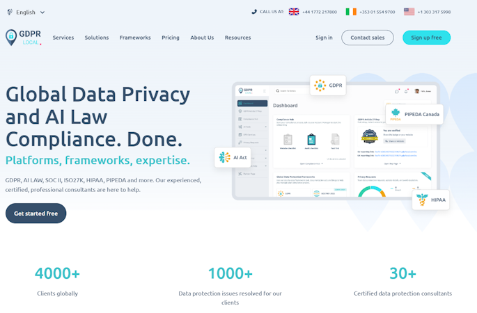 The service draws on a team of over thirty certified data protection consultants with expertise across global privacy frameworks and artificial intelligence regulation. Support is available through multiple communication channels including phone, email, chat and messaging. The organization maintains physical offices in Brighton, England and Dublin, Ireland. Engagement models range from initial free consultations and fast track compliance projects to comprehensive long term strategic governance relationships.