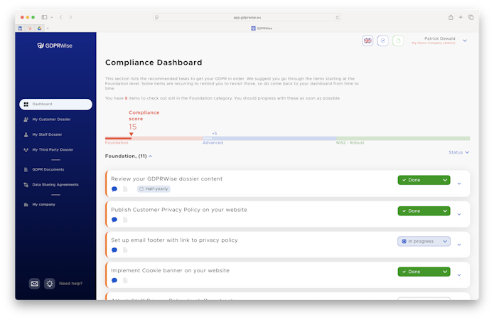 Users can simply confirm the relevant details about what personal data the business processes, and the system handles the technical compliance requirements automatically, saving time while ensuring regulatory adherence. The software generates essential compliance documentation including a complete privacy policy and GDPR register once the dossier is completed. GDPRWise addresses compliance requirements for all types of data processing, covering both digital information stored in cloud systems and physical documents containing personal information.