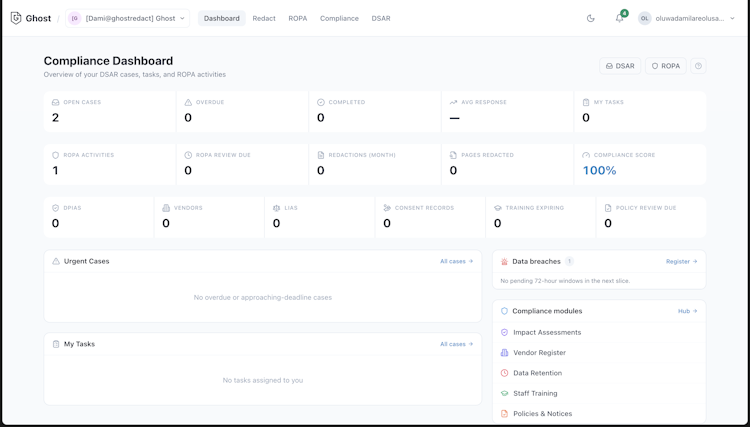 Ghost functions as a GDPR compliance platform that consolidates privacy management workflows into a unified system. It is designed to streamline recurring activities of privacy teams and data protection officers across regulated industries including healthcare, insurance and media. The platform employs a privacy-first architecture, EU-hosted infrastructure and encrypted processing to align with European data protection requirements.