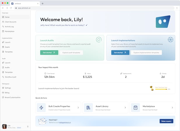 JetStack AI is a platform implementation and audit automation solution designed for revenue operations teams, solution partners and consultants who manage multiple business applications for clients. The software offers two primary modules to support deployment and inspection tasks. The Implementations module enables batch asset migration, bulk configuration actions and one click onboarding sequences across connected client portals. A library of industry specific templates facilitates deployment of CRM properties, deal pipelines, automation workflows, lists, email templates, form assets, lead scoring rules and tracking conventions.