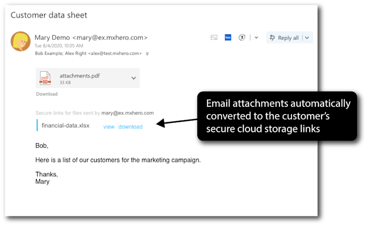 mxHERO Email Attachment Protection keeps you in control of your email attachments wherever your emails end up. Every attachment sent by your organization, regardless of device, is automatically uploaded to your organization's cloud storage service (MS OneDrive, Box, or Egnyte). Attachments are filed in the sender's account and auto-organized by per recipient folders.