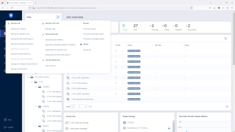 3-2-1 backup strategy: Multiple integrations with storage platforms. Backups and copies can be sent to local storage, SMB/NFS shares, public clouds (Amazon S3, Wasabi, Azure Blob, Backblaze B2, Lyve Cloud, etc.) and other S3-compatible platforms and tape.