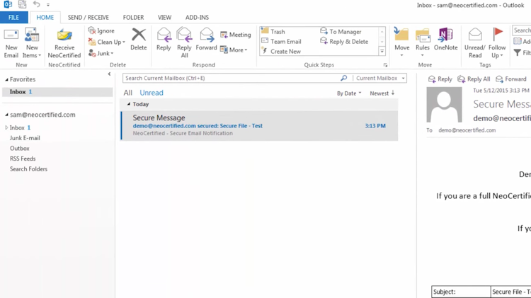 NeoCertified is a secure email service with Outlook integration for sending and receiving sensitive information across a secure platform. The solution serves organizations of all sizes and industries, and meets both state and federal email compliance requirements. The platform enables users to safely send social security and credit card numbers, business contracts, and sensitive documents, and includes solutions for secure mobile email, encrypted email API, and large file transfer. NeoCertified’s email solution facilitates the sending and receiving of encrypted email, whether from a laptop, or mobile device. All files and documents sent or received remain protected throughout the entire encryption process. Once logged in, users are able to set expiration dates on messages, enable read-receipt notifications, email reminders, and unread message alerts. The secure service is compliant with both state and federal regulations, including GLBA, SOX, HIPAA, and SEC. Users can send confidential large files, including documents, videos, or images of up to 1GB, directly from the desktop. Users can send and receive secure emails directly from their Outlook account, or from NeoCertified’s secure cloud portal. The solution is compatible with the latest Microsoft Outlook versions. When a recipient receives an encrypted email, they will be directed to the solution's secure portal to reply. Outlook 365 encryption enables users to compose, send, and receive secure messages directly from Outlook 365, and ensures that all critical data is transmitted and stored safely. Organizations are able to track, retract, and audit all sent emails. NeoCertified’s secure mobile portal is optimized for both convenience and protection, facilitating the sending of secure messages from laptops, tablets, and mobile phones. The platform’s “secure briefcase” temporarily houses private documents while on the go. The secure email API enables businesses to access the email service from their existing business application. NeoCertified’s Customer Connect solution provides users with an HTML encrypted contact form that enables secure conversations with anyone inside of an organization.