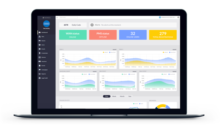Nonius Guest Wi-Fi enables team members to create dedicated landing pages to promote hotel services and optimize customer loyalty programs. With the built-in dashboard, employees can gain insights into online users, registration details, WAN status, user devices, PMS status, and other key metrics. It also lets administrators configure custom SSID, create WiFi vouchers, and set up bandwidth limitations.