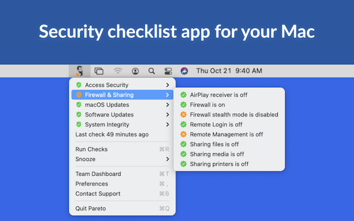 Pareto Security is an app that regularly checks Mac's security configuration. With Pareto Security for business, managers can non-intrusively check that team has correctly configured security on Mac.