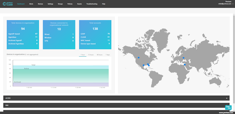 Portnox CLEAR is the only cloud-native network access control (NAC) solution that unifies essential network and endpoint security capabilities: device discovery, network authentication, access control, network hardware administration, risk mitigation and compliance enforcement. As a cloud service, Portnox CLEAR eliminates the need for on-going maintenance such as upgrades and patches and requires no on-site appliances. As such, the platform is vendor agnostic and can be easily deployed, scaled and managed by lean, resource-constrained IT teams across any corporate network - no matter how complex.