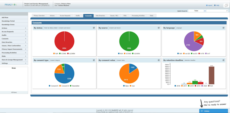 Privacy–Now is a SaaS or on-premise solution for organizations of all sizes to manage data privacy and GDPR compliance. The platform helps organizations to implement their GDPR and privacy compliance project, and easily maintain it over time. Users can manage records of processing activities, PIA/DPIA automation, risks related to personal data management, data subjects consents, access requests, data breaches, cookies and more.