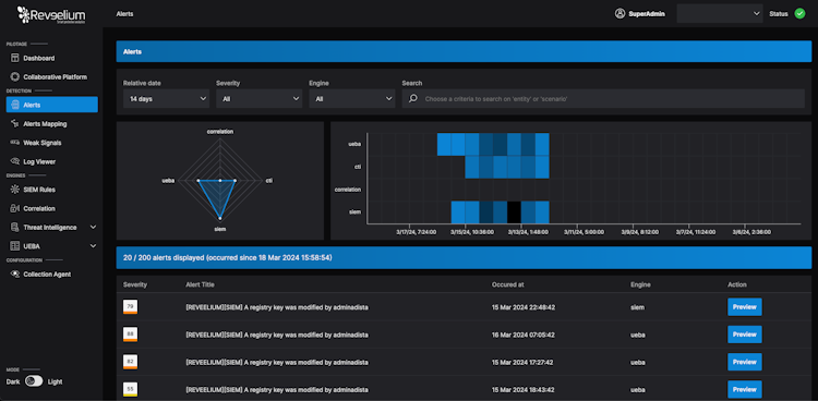Reveelium combines SIEM technology with XDR extended response to enable users to detect cyber threats, protect their information system at 360° and detect abnormal user behavior. Based on 3 detection engines: Behavioral Analysis (UEBA), Threat Intelligence and Correlation, Reveelium allows to quickly block cyber threats. Combined with the reduction of false positives, the prioritization of alerts allows CIOs and CISOs to gain in productivity, while limiting the need for additional cybersecurity skills. Within an hour, the solution can be operational.