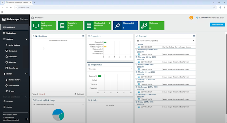 The comprehensive dashboard provides complete visibility of backup operations across all systems and locations, with PowerBI-ready data export capabilities for compliance requirements and stakeholder reporting. SiteBackup reduces total cost of ownership by minimizing administrative overhead through centralized management and enabling organizations to maximize return on investment on existing hardware. The dissimilar hardware restoration feature handles hardware changes effortlessly, while the easy-to-use boot media with automated server connectivity requires minimal technical expertise for system recovery.