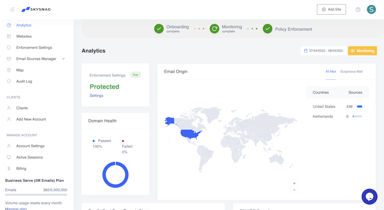 Skysnag is a Cloud-based solution that helps protect businesses from malicious email impersonation through automated SPF, DKIM & DMARC authentication.