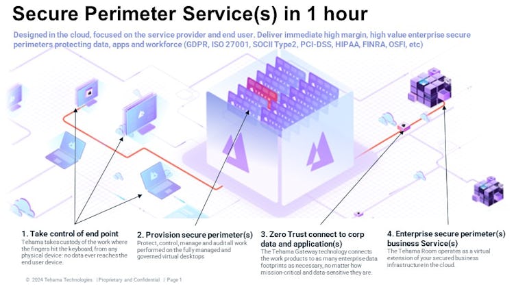 Built in the cloud and designed for enterprises, government agencies, and regulated industries, Tehama provides secure, policy-based access to critical assets while meeting the most demanding standards, including CMMC, SOC 2 Type II, ISO 27001, and HIPAA.