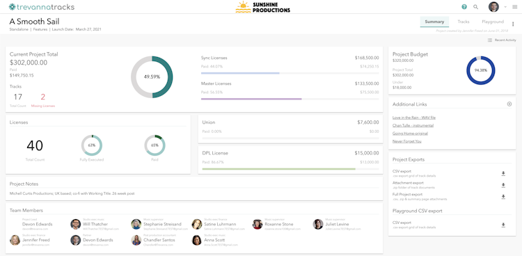 Trevanna Tracks is the premier cloud-based software for managing sync music rights at scale. An intelligent repository across current and historical projects, our clients leverage music use data to inform creative decisions, retain accurate knowledge of the fees associated with each type of music use, share knowledge across the company, and significantly decrease repetitive tasks.