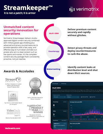 Verimatrix Streamkeeper offers comprehensive protection for the entire OTT streaming distribution ecosystem, integrating Multi-DRM, Watermarking, and Counterspy™ — the company’s zero-code, anti-piracy deployment technology.