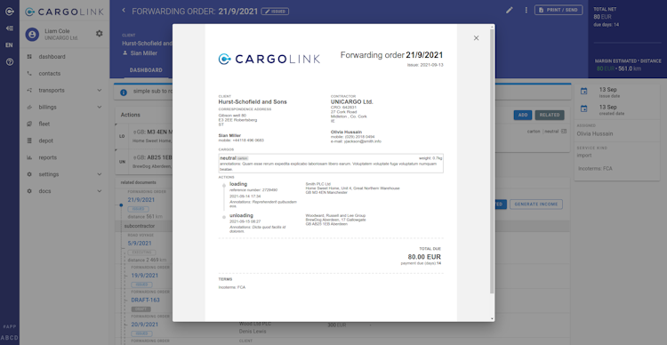 The software allows businesses to integrate and automate their freight management operations by reproducing processes within the TSL industry. Companies can use CargoLink to manage their shipments and transports, including tasks such as route planning, CMR and BOL documents, cargo geolocations, invoices, emails, and automatic customer notifications. The platform enhances transport and forwarding order creation, helps companies organize contacts, and verifies their customer base. It also supports direct communication and file-sharing from the system to the customer.