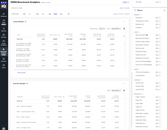 DAT iQ is a cloud-based data analysis solution for freight Brokers and Shippers. This product delivers comprehensive rate, capacity, and performance analytics solutions to equip Shippers and Brokers with actionable insights to reduce costs, increase efficiency, and take charge of their network. DAT iQ's dashboard provides a 360 degree view of carrier performance and key metrics, reducing the time it takes to identify carrier best-bet opportunities.