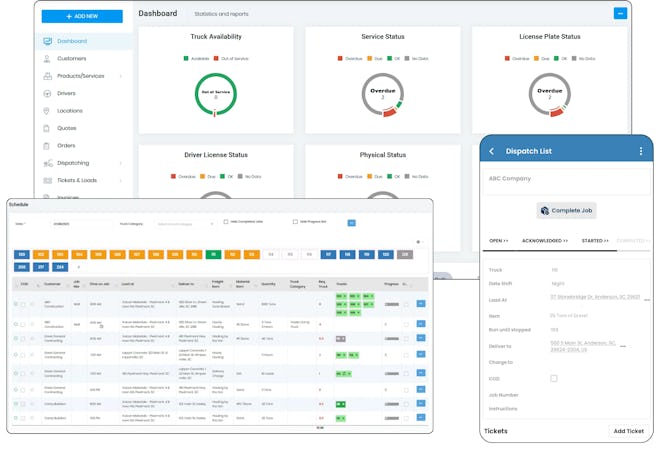 The solution provides comprehensive functionality across the entire operational lifecycle of dump truck businesses. The quoting module enables detailed estimates that automatically populate order records and eliminate duplicate data entry. A visual, color-coded scheduling interface displays truck and driver status at a glance, with drag-and-drop functionality for reassignment of jobs or adjustment of delivery dates due to weather or customer requests. Dispatchers can notify all drivers simultaneously through a single action, and drivers acknowledge assignments within a mobile application. Ticket management tracks both system-generated and physical quarry tickets, identifying missing documentation to minimize lost records. Batch invoice creation generates customer invoices from selected tickets in seconds, substantially reducing manual invoicing time. Fleet managers benefit from driver pay statements, regulatory compliance indicators and maintenance dashboards that offer real-time visibility into equipment health and certification status. Customer and subcontractor portals extend visibility to external stakeholders, allowing clients and third-party haulers to view job details, manage their own assets and respond with availability within the same dispatch workflow. Revenue reporting and analytics dashboards present performance metrics broken down by truck, driver, customer and date, providing operational insights without the need for separate spreadsheet analysis.