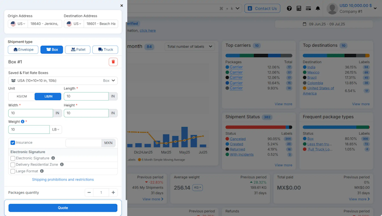 It integrates with different marketplaces and e-commerce platforms, including Shopify, WooCommerce, Amazon, Wix, and Mercado Libre to sync orders, automate label creation, and show real-time rates at checkout. Businesses can access discounted carrier rates, and optional fulfillment services are also available.