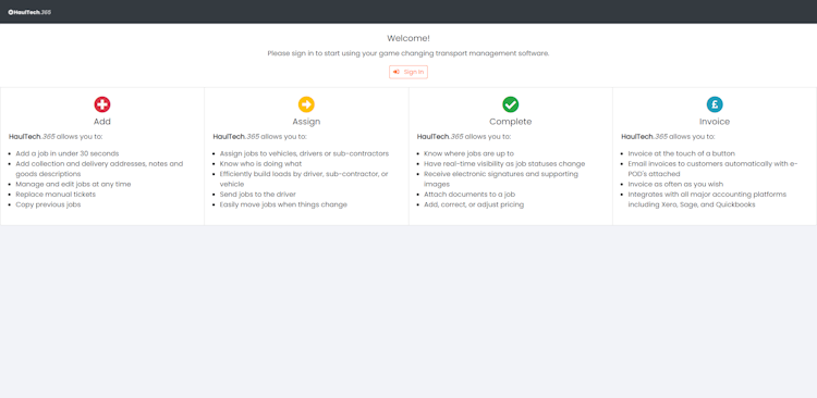 All major accounting partners, including KeyPrime Accounts, Sage, Quickbooks, and Xero, are compatible with the system. HaulTech Transport Management Software allows businesses to add new jobs, collection and delivery addresses, notes, and goods descriptions on a unified interface. Teams can manage and edit jobs at any time, replace manual tickets, copy previous jobs, assign jobs to vehicles, drivers or sub-contractors, efficiently build loads by the driver, sub-contractor or vehicle and send jobs to the driver.